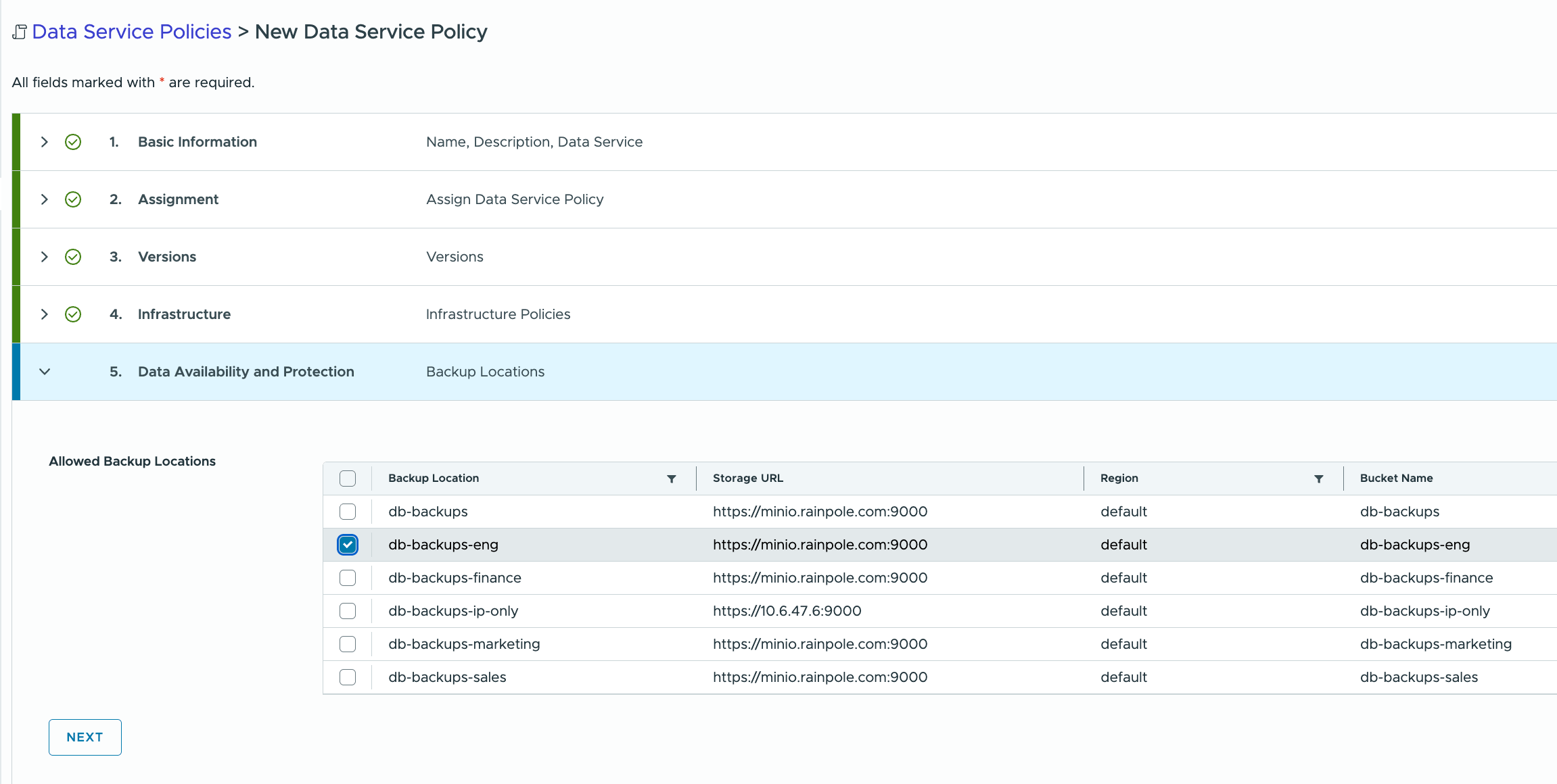 If desired, a backup location is now chosen as part of the Data Availability and Protection setting. Again, there is the ability to assign certain backup S3 compatible buckets to certain groups of users through the use of a DSP. DSPs allow admins to decide which buckets to assign to which users. This could be based on capacity, performance, retention, encryption and other factors, depending on the requirements of the user.