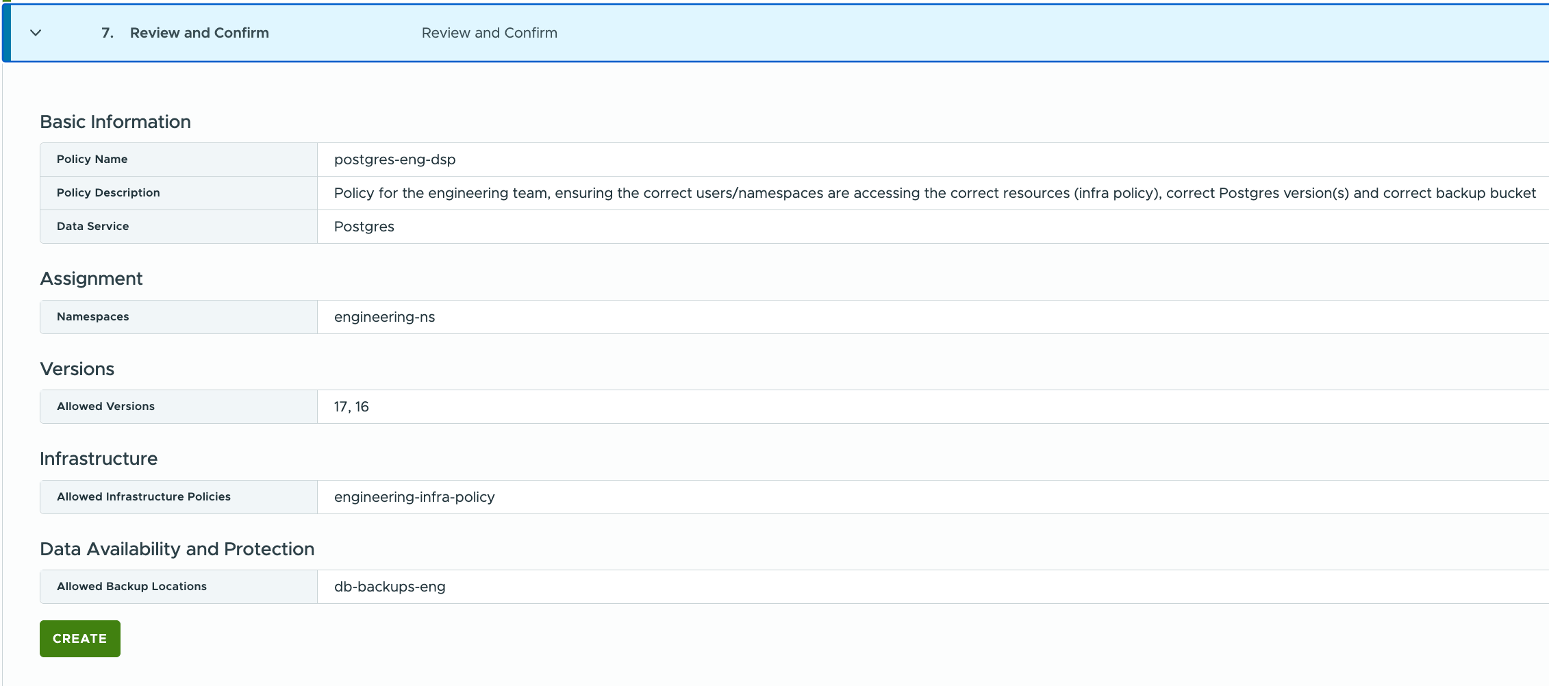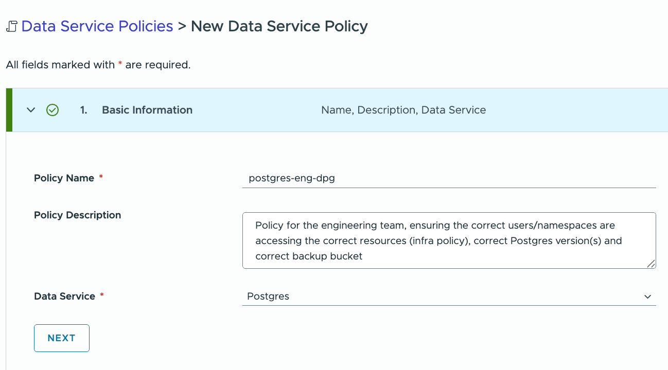 With the AD engineering group imported, and the users associated with the ‘engineering-ns’ namespace, I can now proceed with the creation of the Data Service Policy (DSP). The next objective is to grant these engineering users access to certain versions of the Postgres engine, and provide them with a dedicated backup location. Under Basic Information, provide the policy name, optional description and which data service the policy is associated with: