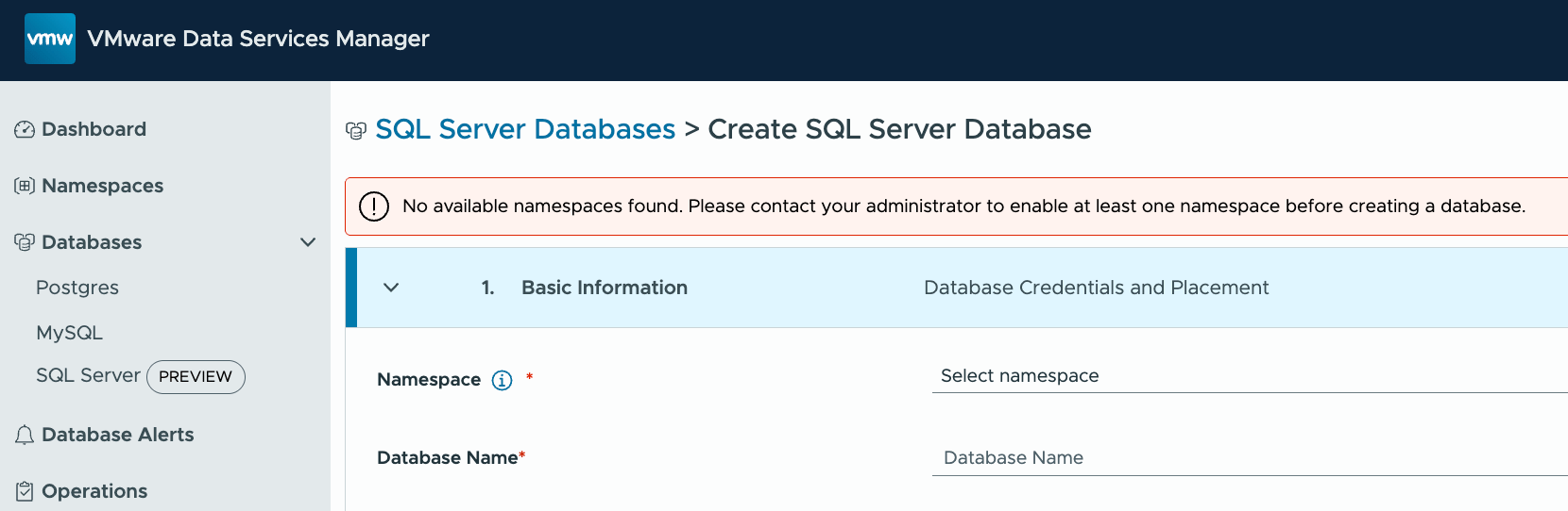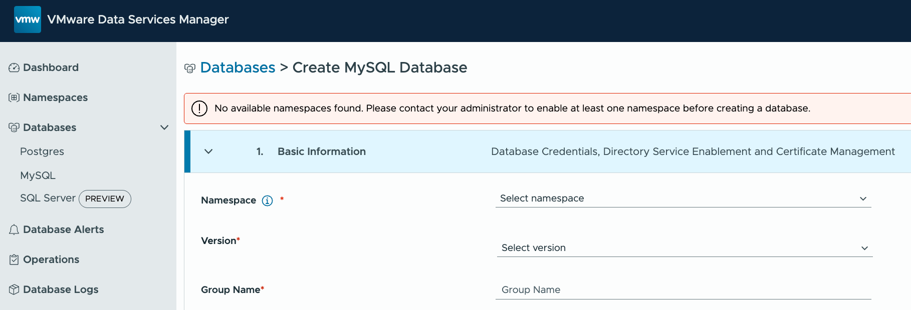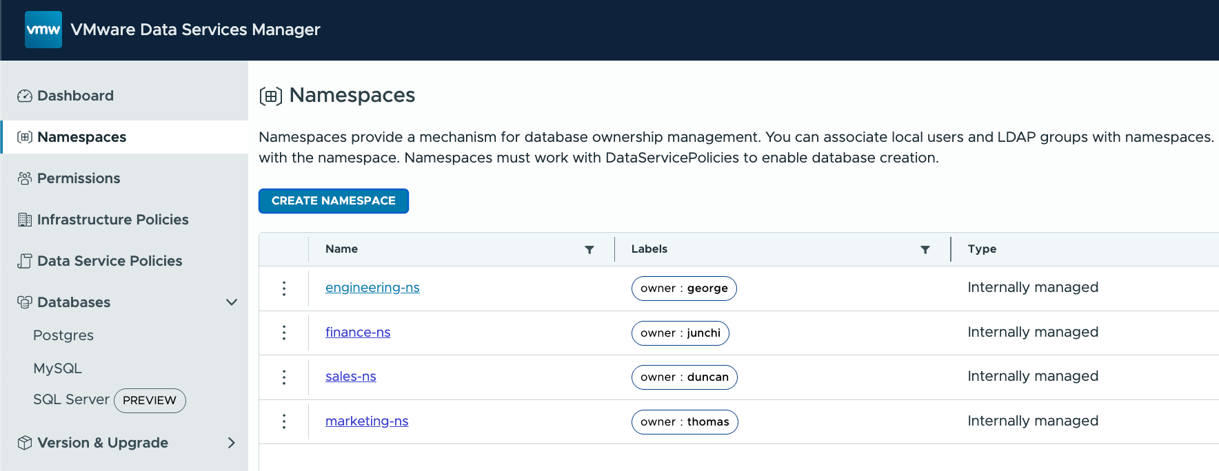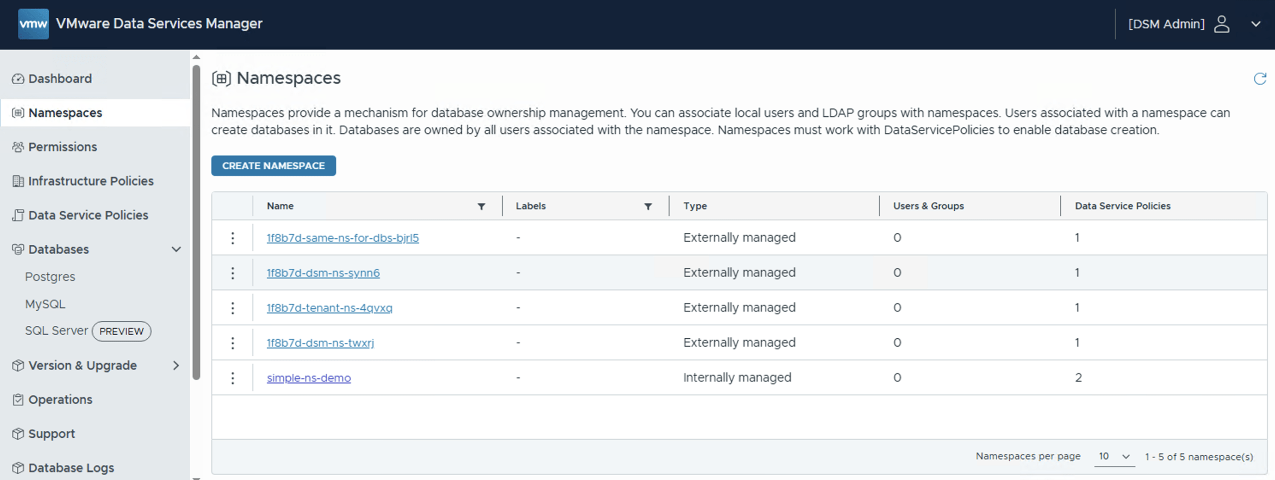 The most visible feature in Data Services Manager (DSM) 9.0.1 is the appearance of some additional new objects in the navigation menu on the left hand side of the DSM UI. These are Namespaces and Data Services Policy. Customers who have already looked at VCF Automation, particularly as it integrates with DSM, may have some familiarity with these. Their purpose in DSM 9.0.1 is to align with RBAC features that are already in VCF Automation, specifically around multi-tenancy controls. Through the use of Namespaces and Data Service Policies in DSM 9.0.1, a DSM admin can now control which DSM users can consume which vSphere resources (via infrastructure policies). A DSM admin can also control which data engines DSM users have access to, as well as the versions of those data engines. Lastly, a DSM admin can specify which backup locations a DSM user is allowed to send their backups to. In this post, I will show you step by step how these new RBAC features work in tandem to provide multi-tenancy controls in stand-alone DSM 9.0.1.