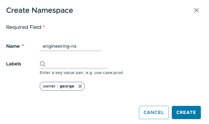 The first step, as a DSM admin, is to create a new Namespace object in DSM. This will be used to hold my engineering users. Simply give it a name a an optional label or labels for identification purposes. In this case, I have set a single label called “owner: george” to remind me who in the engineering team will be using the data service. But you can use labeling for any number of different purposes.