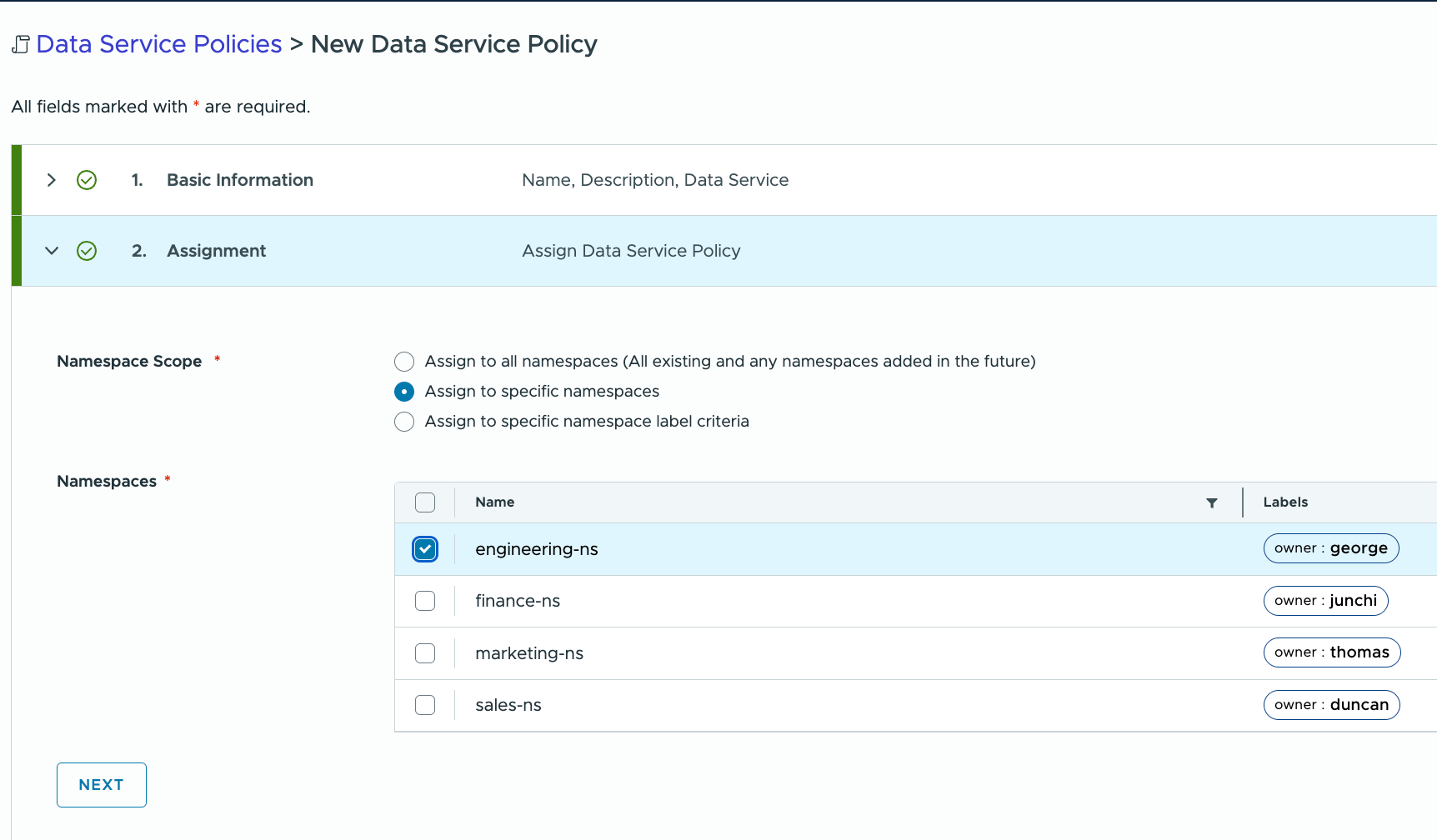 Click Next. The next step is to define the Namespace Scope. In other words, this is deciding which users can use this Data Service Policy. As I am focused on my engineering users, I am only going to select the ‘engineering-ns’ which means that any users who are in that namespace will be able to use this DSP. You could, of course, include additional namespaces in this DSP or create additional Postgres DSPs for other namespaces if you so wish.