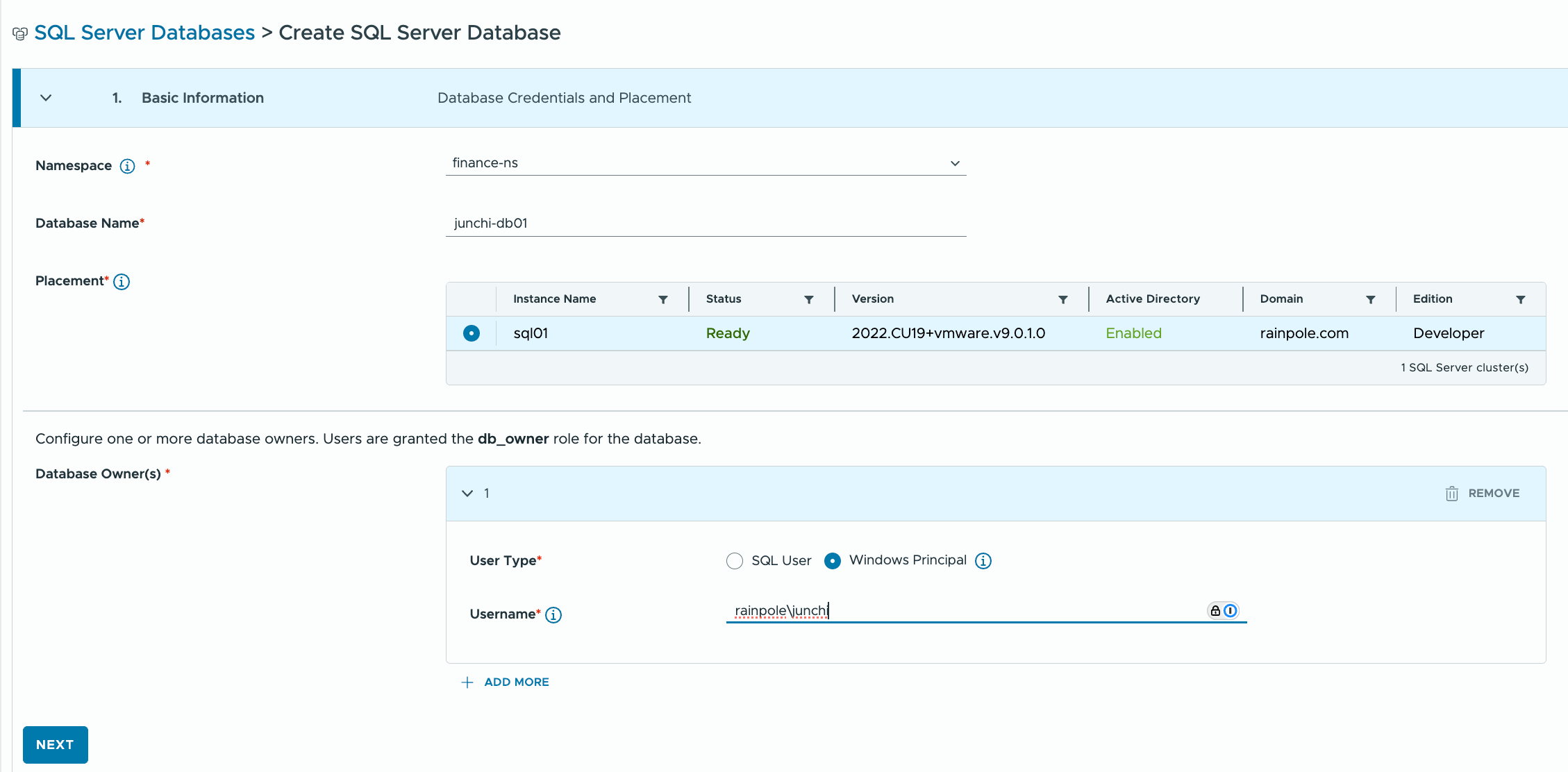 I already know that the user that I want to have create the database, “junchi”, is a member of an AD Group that I have already imported into DSM. You can check this via the Permissions view as a DSM Admin. The user “junchi” has been added to DSM via the “finance-ns” namespace. This means that “junchi” can login to the DSM portal as a DSM user, and will have access to whatever resources the “finance-ns” namespace has been granted through Data Service Policies. For “junchi” to create a SQL Server database, at least one SQL Server instance needs to have been associated with the “finance-ns” namespace via a Data Service Policy.